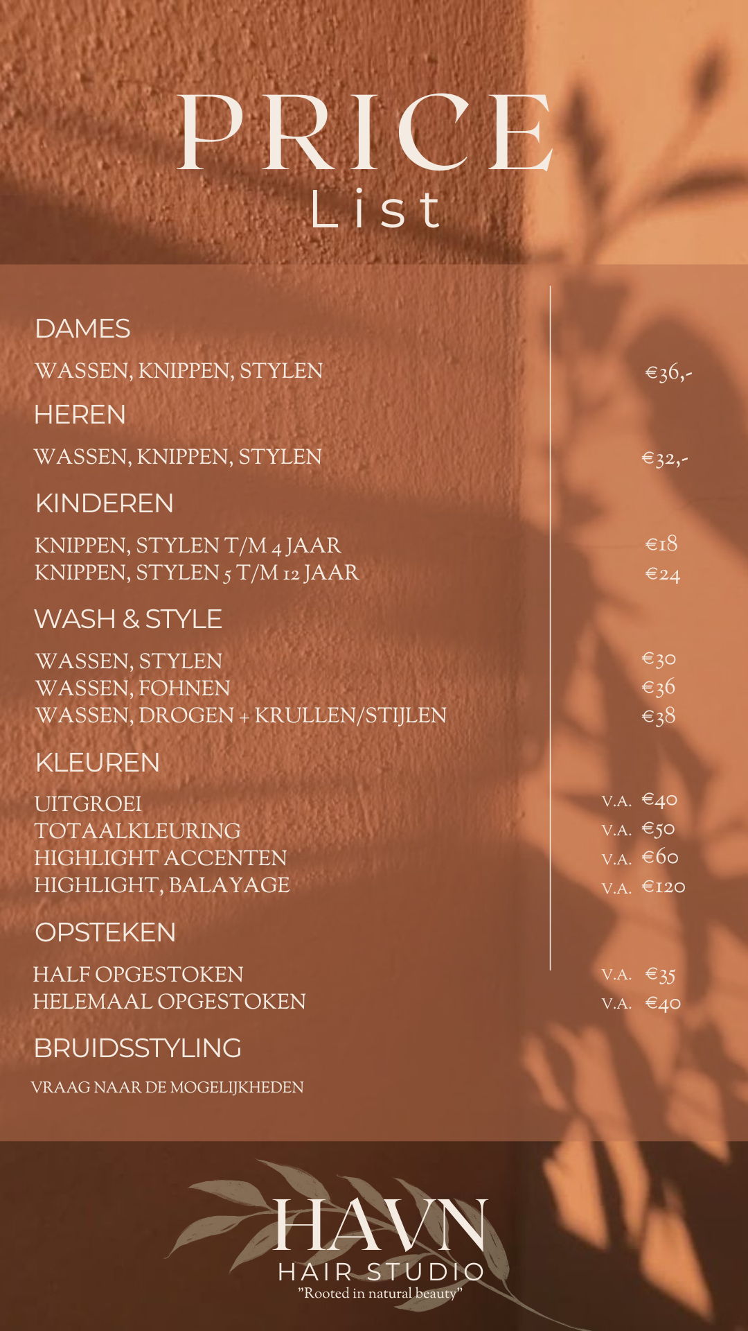 Alle prijzen zijn bij volwassenen inclusief wassen en styling. Tijdens elke behandeling is verzorging altijd inbegrepen en stem ik deze zorgvuldig af op de behoeften van jouw haar. Ik werk met KIS Haircare, waarbij het haar precies krijgt wat het nodig heeft. Van een lichtgewicht conditioning tot een intensief verzorgend masker.